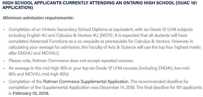 在多大罗德曼商学院(Rotman)的官网,就能看到rotman的录取最低标准【点击进入】。虽然官网说平均分85%就可以申请Rotman本科了,但是成功拿到offer的学生一般都有92分以上,并且需要写非常多额外的申请材料和视频面试和文书。想详细了解加拿大大学商科商学院的同学,建议阅读这篇文章《想了解加拿大大学商学院?看这篇就够了》,里面详细介绍并对比了加拿大5大商学院。