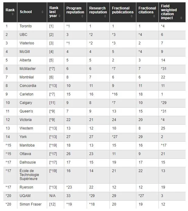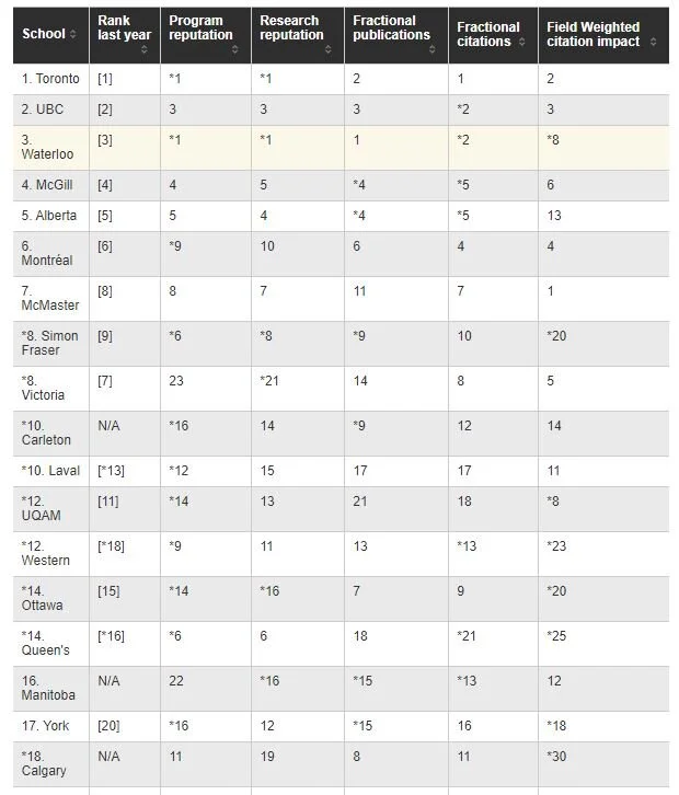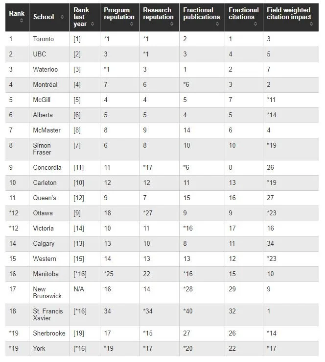 本校加拿大排名:QS加拿大大学排名2020年第1名