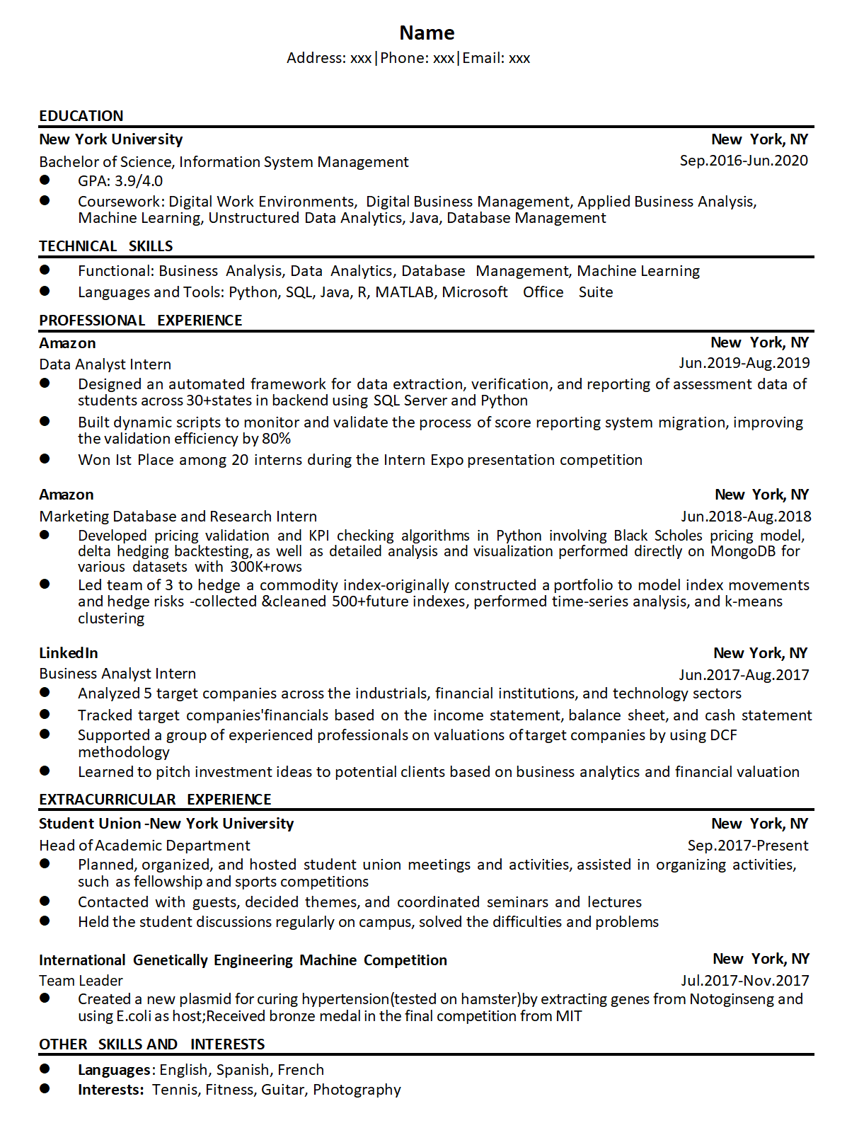 √ 实习经历:用 “情境 + 任务 + 行动 + 结果”(STAR 法则),如 “在某咨询公司实习期间,主导某零售业客户的供应链优化项目,帮助其降低库存成本 18%”;